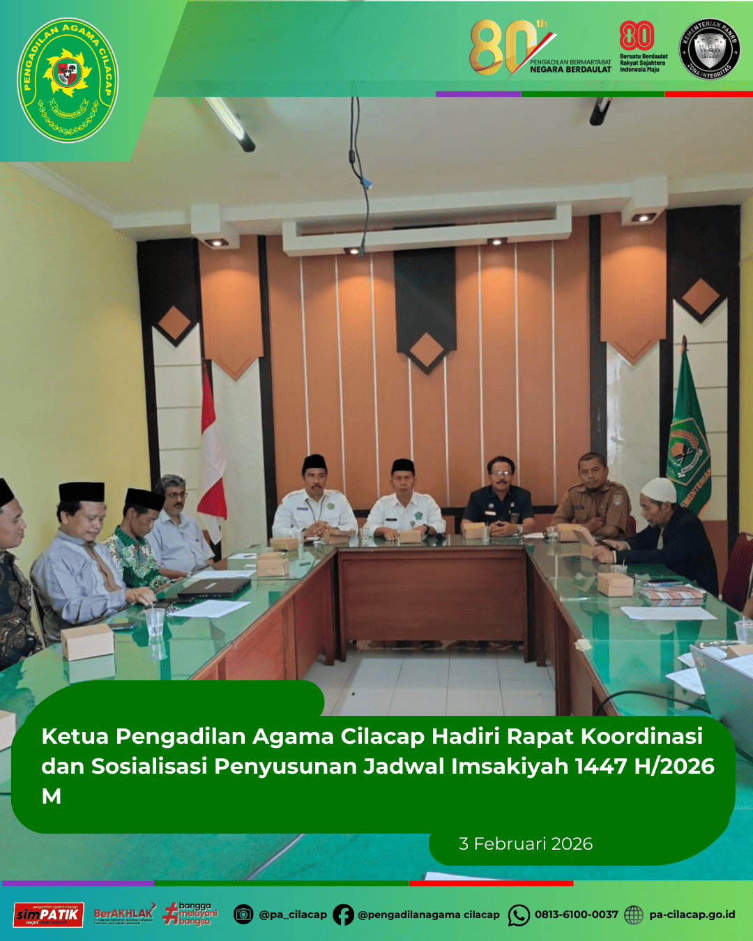 -Cilacap- Dalam rangka menyambut bulan suci Ramadhan 1447 Hijriah, Kantor Kementerian Agama Kabupaten Cilacap menggelar Rapat Koordinasi dan Sosialisasi Penyusunan Jadwal Imsakiyah 1447 H/2026 M. Kegiatan ini berlangsung di Ruang Rapat Kantor Kemenag Kabupaten Cilacap pada Selasa (3/2/2026).